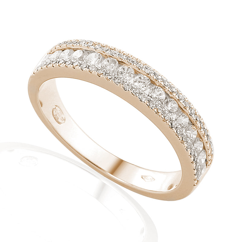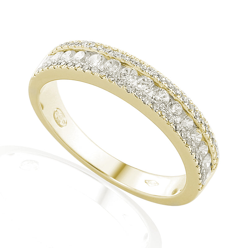 This timeless 18K gold eternity ring features fifteen dazzling F/VS quality diamonds in a half eternity setting together with fifty eight smaller side stones. Crafted with 3.70 grams of gold, the 0.50 CT total diamond weight with 15 + 58 round brilliant diamonds is perfect for any special occasion. You can choose between white, yellow and rose Antwerp refined gold.
